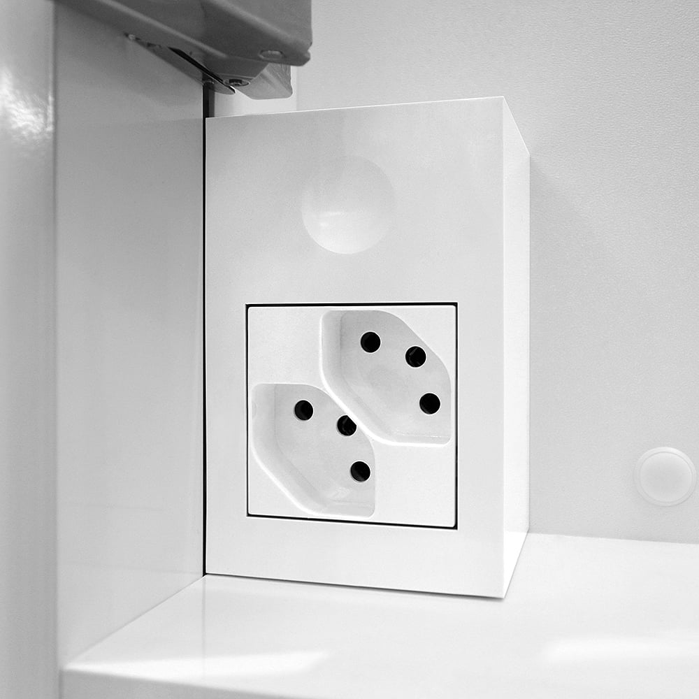 ist genau dort angebracht, wo sie gebraucht wird – im untersten Fach in einer der Ecken. So baumelt kein Kabel von oben vor Ihnen herum. In diesem Fach werden gerne die elektrische Zahnbürste oder der Rasierer verstaut. Ideal, wenn sich die Stromzufuhr direkt daneben befindet. Ab 80 cm sind zwei Doppelsteckdosen verbaut.